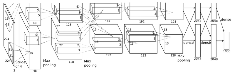 위 그림에서 잘린 부분은 GPU 병렬 연산을 표현하기 위한 것이다. 여기에 더해진 것들은 ReLU 활성화 함수와 드롭아웃(Dropout) 그리고 오버래핑 풀링(Overlapping pooling) 등이 적용되었다고 한다.